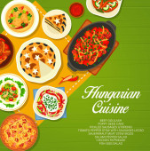 Węgierska kuchnia posiłki menu okładka. Warzywny gulasz wołowy, morele z serem i chlebek płaski Langos z kwaśną śmietaną, papryka nadziewana bryndza, pasztet jajeczny i zupa rybna z papryki, gulasz z żeberek wieprzowych