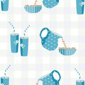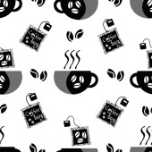 Worek kawy i wektor fasoli bezszwowe tło wzoru. Brązowy biały tło z jednorazowy świeżo zaparzony saszetka latte, americanos. Ręcznie rysowane ikony napoju kofeinowego Grunge do pakowania