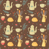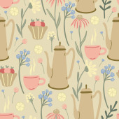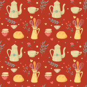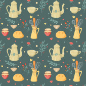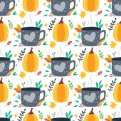 Płynny wzór. Jesienny zestaw czajnik, cytryna, gumowe buty. Hygge 'a. Wektor w stylu kreskówki.
