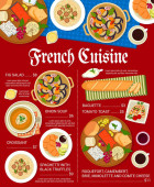 Kuchnia francuska posiłki szablon menu. Pieczony dorsz z Bechamel, smażona wątróbka i ratatouille gulasz, fricassee nerki, kurczak z sosem szampana i zupą grochową, sałatka z tuńczyka Nicoise, sałatka z piersi kaczki