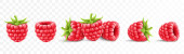 Zbiór dojrzałych malin izolowanych na przejrzystym tle. Naturalny letni owoc, realistyczna ilustracja wektora 3D. Składnik na soki, dżemy, jogurty, kompoty. Makieta do projektowania opakowań