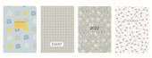 Zestaw szablonów okładek na podstawie wzorów z kurcząt, ptaków, motyli, ćmy, kraty, kręgów abstrakcyjnych. Niebieski, tło dla notatników, notatników, pamiętników, planisty. Odizolowane nagłówki