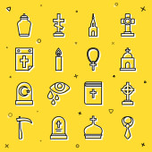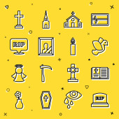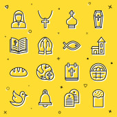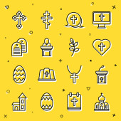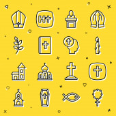 Ustaw linię Kościół kazanie trybuna Chrześcijański chleb krzyż z kulą ziemską Różaniec koraliki religia Trumna Wielkanoc ciasto i ikona. Wektor.