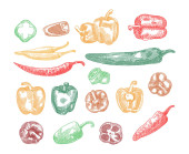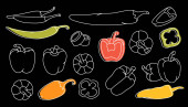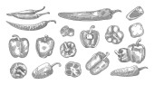Gorące chili i papryka. Całe i pół różnej papryki. Wegetariańskie zdrowe jedzenie. Produkty rolne. Ilustracja wektora izolowana na białym tle.