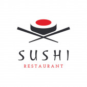 Szablon logo sushi. Jedzenie lub tradycyjna japońska kuchnia z łososiem, pyszne jedzenie.Logo dla japońskiej restauracji, bar, sklep sushi.