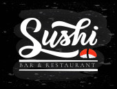 Szablon logo sushi. Jedzenie lub tradycyjna japońska kuchnia z łososiem, pyszne jedzenie.Logo dla japońskiej restauracji, bar, sklep sushi.