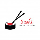 Szablon logo sushi. Jedzenie lub tradycyjna japońska kuchnia z łososiem, pyszne jedzenie.Logo dla japońskiej restauracji, bar, sklep sushi.