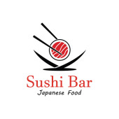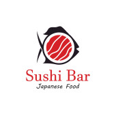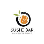Szablon logo sushi. Jedzenie lub tradycyjna japońska kuchnia z łososiem, pyszne jedzenie.Logo dla japońskiej restauracji, bar, sklep sushi.