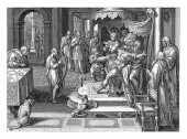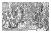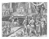 Scipio zwraca przyszłemu mężowi dziewicę, którą otrzymał w nagrodę za zwycięstwo. Tekst łaciński w dolnym marginesie.