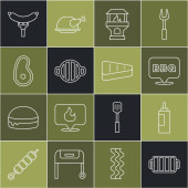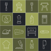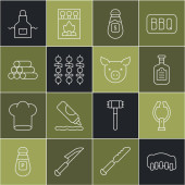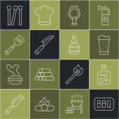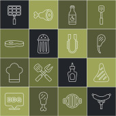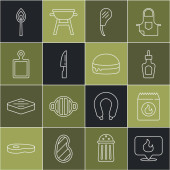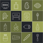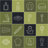 Ustaw linię Cięcie deska, Widelec do grillowania, Ryby, Spatula, Kiełbasa na, Zapalniczka i grillowane shish ikona kebab. Wektor