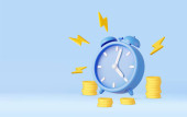 Budzik 3D i monety. Czas to pieniądz. Inwestycje biznesowe, zyski i oszczędności finansowe, zarządzanie budżetem, rachunek oszczędnościowy. Szybkie pieniądze. Renderowanie 3D. Ilustracja wektora
