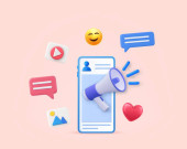 3d megafon głośnik lub głośnik bullhorn do ogłoszenia promocji, megafon głośnomówiący z mediów mobilnych i społecznościowych, głośnik. alarm i ogłoszenie. Renderowanie 3D. Ilustracja wektora