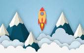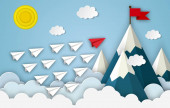 3d papierowy samolot z chmurami Minimalna kreskówka ładny gładki. koncepcja kreatywnego przywództwa wizji. Nowoczesny modny design. Renderowanie 3D. Ilustracja wektora