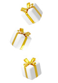 3D białe pudełka ze złotą wstążką i łukiem. Pomysł na urodziny. Wesołego Nowego Roku i Wesołych Świąt białe pudełka prezentów ze złotymi łukami. Renderowanie 3D. Ilustracja wektora
