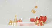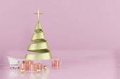 3D projekt Bożego Narodzenia, złoty metaliczny stożek spiralny drzewo z pudełek prezentów i podium. Święta i Nowy Rok. Renderowanie 3D. Ilustracja wektora