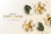 3d Wesołych Świąt i Szczęśliwego Nowego Roku. Boże Narodzenie projekt realistyczne prezenty pudełko, spadające balony helu, tło prezent wakacje. Plakat, baner, broszura, ulotka. Renderowanie 3D. Ilustracja wektora