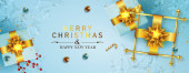 3d Wesołych Świąt i Szczęśliwego Nowego Roku. Boże Narodzenie projekt realistyczne prezenty pudełko, spadające balony helu, tło prezent wakacje. Plakat, baner, broszura, ulotka. Renderowanie 3D. Ilustracja wektora