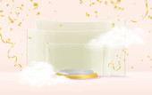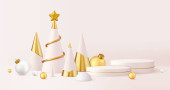 Projekt 3D Christmas, złoty metaliczny stożek spiralny drzewo z podium. Wesołych Świąt i szczęśliwego Nowego Roku do prezentacji produktu. Renderowanie 3D. Ilustracja wektora