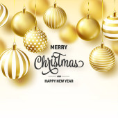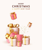 3d Wesołych Świąt i Szczęśliwego Nowego Roku Tło z pudełka z prezentami. Złote bombki świąteczne, kulki, brokat. Renderowanie 3D. Ilustracja wektora
