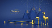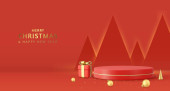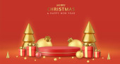 3D Boże Narodzenie i Nowy Rok studio podium z 3d bombki kulki, drzewa stożkowe, pudełko prezentów. Kreatywny świąteczny szablon. Zimowa kompozycja świąteczna. Baner i plakat internetowy. Renderowanie 3D. Ilustracja wektora