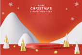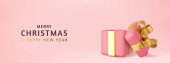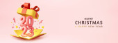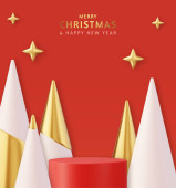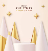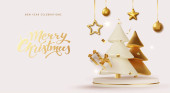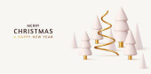 Projekt 3D Boże Narodzenie, złoty metaliczny stożek drzewa, abstrakcyjne choinki. Święta i Nowy Rok. Kartka z życzeniami, baner, plakat. Renderowanie 3D. Ilustracja wektora