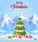 3d Wesołych Świąt i szczęśliwego Nowego Roku tle. Choinka, śnieżki, bałwan i pudełka prezentów. Kartka świąteczna, baner, plakat internetowy. Renderowanie 3D. Ilustracja wektora