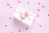 3d Christmas style Produkt podium sceny z latający biały prezent pudełko ze złotym łukiem. Wesołych Świąt i Nowego Roku świąteczny projekt baner, kartka z życzeniami. Renderowanie 3D. Ilustracja wektora