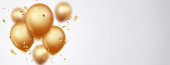 Balony 3D ze wstążką. Uroczysty design ze złotymi balonami z błyszczącym konfetti. Stylowy plakat, okładka, baner, strona, aplikacja mobilna. Renderowanie 3D. Ilustracja wektora