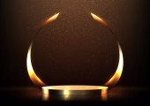 3d Złote podium pod spadającym złotym brokatem izolowane na ciemnym tle. Świecący neonowy złoty krąg z błyszczącymi. Pusty minimalny pierścień dekoracji sztuki. Renderowanie 3D. Ilustracja wektora