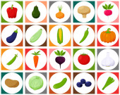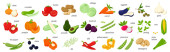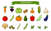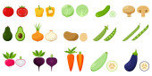 Zestaw świeżych warzyw z podpisanymi przedmiotami. Całe i pół. Kolekcja dekoracyjnych elementów projektu żywności dla receptur, menu, ikon internetowych. Ilustracja wektora w płaskim stylu, odizolowany na białym tle.