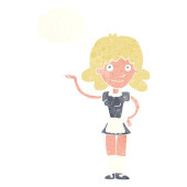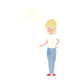 kobieta kreskówka z rękami na biodrach z myśli bańka