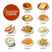 Japoński wektor żywności ustawiony. Zestaw słynnych potraw w Japonii płaski wektor ilustracji, clipart kreskówki. Sushi, Ramen, Udon, Soba, Tempura, . Azjatyckie jedzenie. Japońska kuchnia. Japoński wektor żywności projekt
