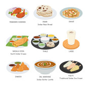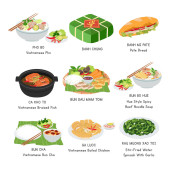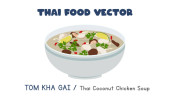 Tajski wektor żywności ustawiony. Zestaw słynnych potraw w Tajlandii płaski wektor ilustracji, clipart kreskówki. Tom Yum, Tom Kha Gai, Wołowina Tygrysa, Pla Pao. Azjatyckie jedzenie. Tajska kuchnia. Projekt wektora tajskiej żywności