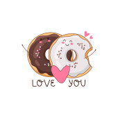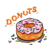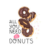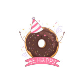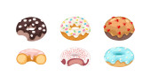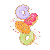 Set of colorful donuts. Vector illustration of a donut character in doodle style. Perfect for used for cafe, bakery or manufacturer's website. Ideal for stickers, postcards, banners or posters.