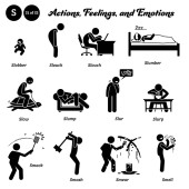 Stick figure human people man action, feelings, and emotions icons alphabet S. Strategize, stray, streak, strengthen, stress, stretch, stride, strike, string, and strip.
