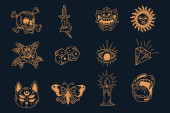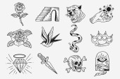 Old school tattoo. Retro sailor black outlines tattooing style, american traditional designs. Hand drawn flash tattoos vector illustration set. Isolated stickers as diamond, bird, nautical elements
