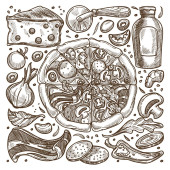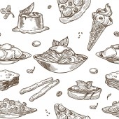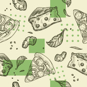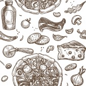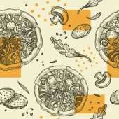 Pizzeria smaczne dania i przepisy kulinarne, pizza z warzywami i mięsem. Salami i grzyby, cebula i pomidory, oliwki i zioła. Płynny wzór wydruku lub tapety tła. Wektor w płaskim stylu