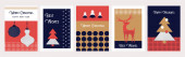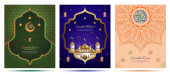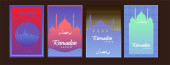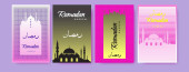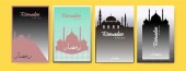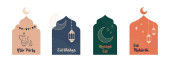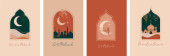Kolekcja nowoczesnego stylu Ramadan Mubarak i eid al fitr. Karty okolicznościowe o minimalnej konstrukcji boho, księżyc, kopuła meczetu i latarnie. ilustracja wektora