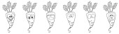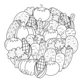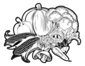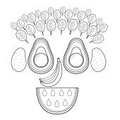 Czarno-białe owoce i warzywa. Zabawna zdrowa głowa strony kolorowanki z fig zamiast oczu, papryka chili zamiast ust, kukurydza zamiast nosa, kokos zamiast uszu. Ilustracja wektora