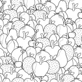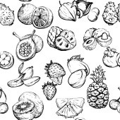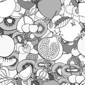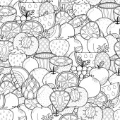 Doodle owoce bezszwowy wzór do kolorowanki. Kolorowanka żywności. Czarne i białe tło z kokosem, smoczym owocem, arbuzem itp. Ilustracja wektora