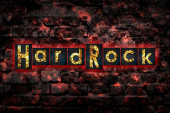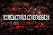 Twarda Skała. Słowa zrobione z zardzewiałych żelaznych liter, na starych ceglanych ścianach. Kierunek w muzyce. Styl muzyczny. Element projektu.