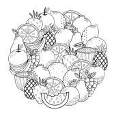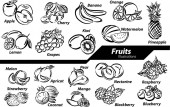 Kolekcja czarno-białych owoców. Zdrowe jedzenie izolowane elementy w stylu kreskówki. Świetne do kolorowania strony, przepisy kulinarne, książka kucharska. Jabłko, mango, kiwi, kokos i więcej. Ilustracja wektora