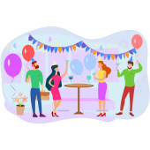 Szczęśliwi ludzie bawiący się na biurowej imprezie. Podekscytowane dziewczyny biurowe i faceci świętujący sukces razem. Impreza korporacyjna, działalność team building, koncepcja imprezy firmowej.