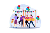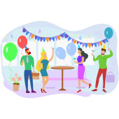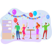 Szczęśliwi ludzie bawiący się na biurowej imprezie. Podekscytowane dziewczyny biurowe i faceci świętujący sukces razem. Impreza korporacyjna, działalność team building, koncepcja imprezy firmowej.