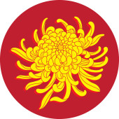 Ilustracja czerwonego chryzantemy kwiat na niebieskim tle koła.