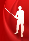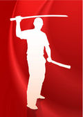 karate sensei z mieczem na przepływające jedwab tło