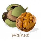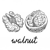 Liście orzecha włoskiego i ikony wektorowe owoców orzecha włoskiego. Natura i ekologia. Orzech, liść, roślina, rysunek, liście, płód i więcej. Izolowana kolekcja liści orzecha włoskiego do stron internetowych na białym tle.