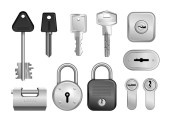 Zdjęcie "Realistyczne klawisze ikona dziurki zestaw jeden klucz z zestawu jest wstawiony w ilustracji wektor zamka" może być wykorzystywane do celów osobistych i komercyjnych zgodnie z warunkami zakupionej licencji Royalty-free. Obraz jest dostępny do pobrania w jakości wysokiej rozdzielczości do 5760x3840.