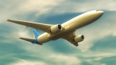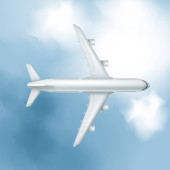 3d biały samolot lot w koncepcji podróży wektor powietrza nieba. Realistyczne odwzorowanie odrzutowca na niebieskim tle z chmurą. Linia lotnicza baner komercyjny dla lotów międzynarodowych na wakacje. Start czarterowych statków powietrznych.