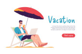 Młoda kobieta w kapeluszu i okularach, siedząca na leżaku z laptopem na plaży i pijąca koktajl. Ilustracja wektora.